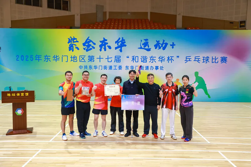 2025年11月27日,第十七届“和谐东华杯”乒乓球赛在地坛体育馆举行。商务部干部职工乒乓球代表队连续过关斩将,最终在22支参赛队伍中脱颖而出,荣获冠军。