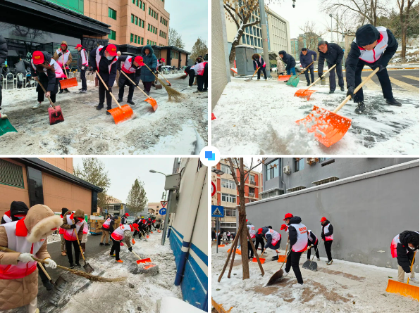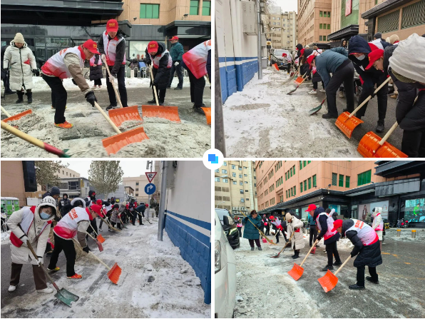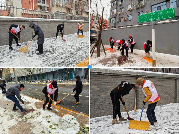 面对已经结冰的地面路段,大家配合默契,敲的敲、铲的铲、推的推、扫的扫,齐心协力清除积雪结冰,扫出了暖心通道、爱心胡同。各种工具声在街道、胡同此起彼伏,经过一下午的劳作,大家在寒风中汗流浃背,身体疲劳却心情畅快。