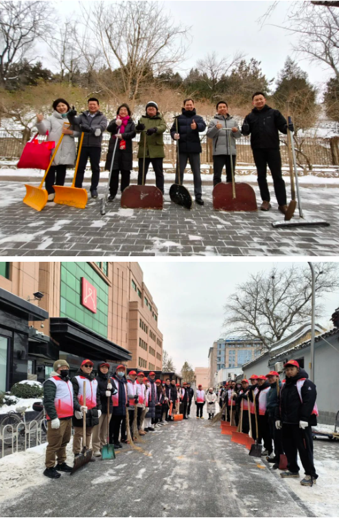 大家“兵分两路”,分赴台基厂社区大华路、王府井社区胡同,全力协助做好防灾工作。活动中,大家不畏低温、不惧寒风、不怕脏累,拿着铁锹、铲子、扫帚等工具,弯下身子,抡起工具,热火朝天开展扫雪清冰。